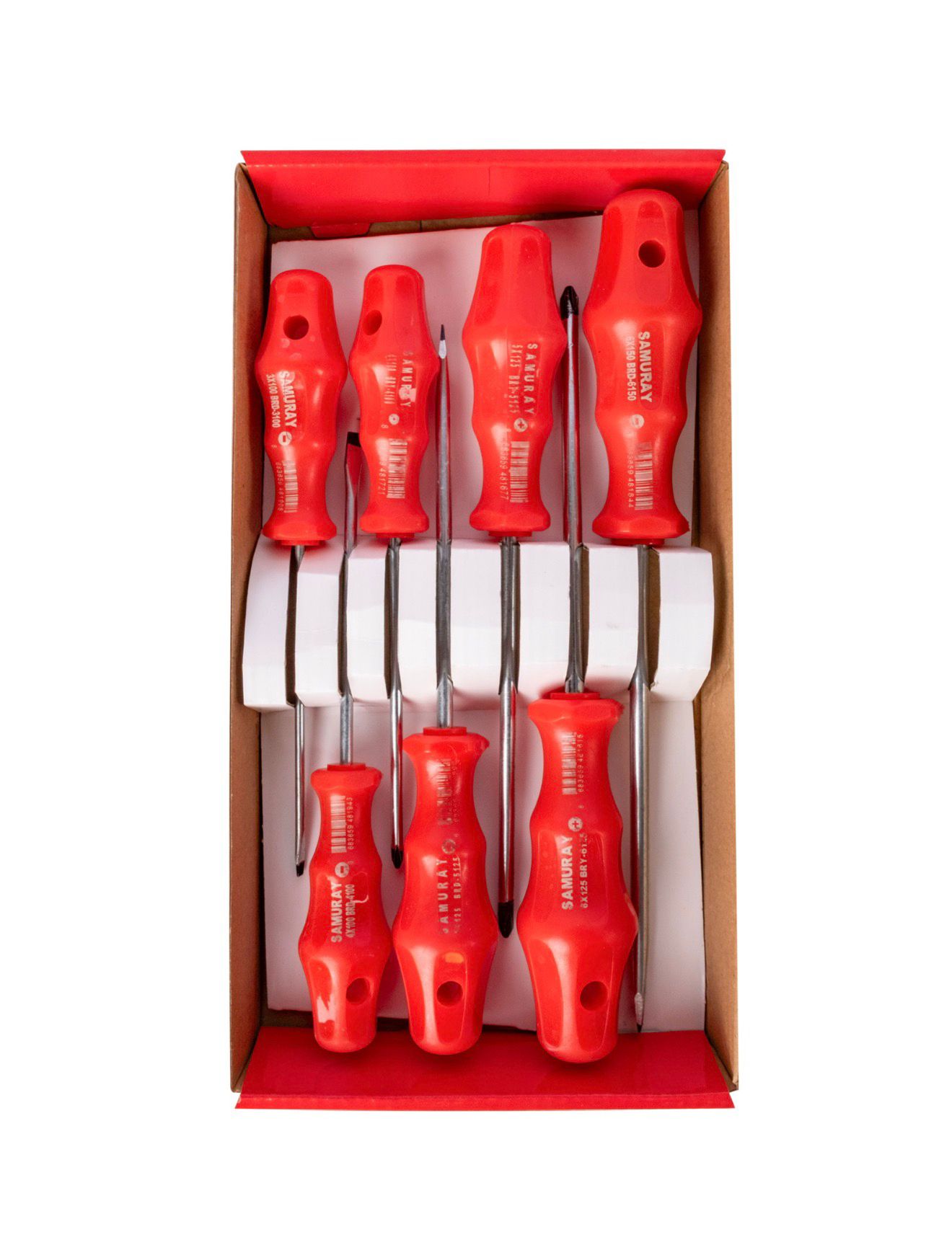 Samuray Profesyonel Tornavida Seti 7’li – 7000, günlük tamir, bakım‑onarım, montaj ve hobi işleri için eksiksiz ve dayanıklı uç çeşitlerini bir araya getiren yüksek kaliteli bir el alet setidir. Ergonomik saplara sahip olan bu set, hem profesyonel kullanıcılar hem de ev atölyeleri için ideal çözümler sunar.