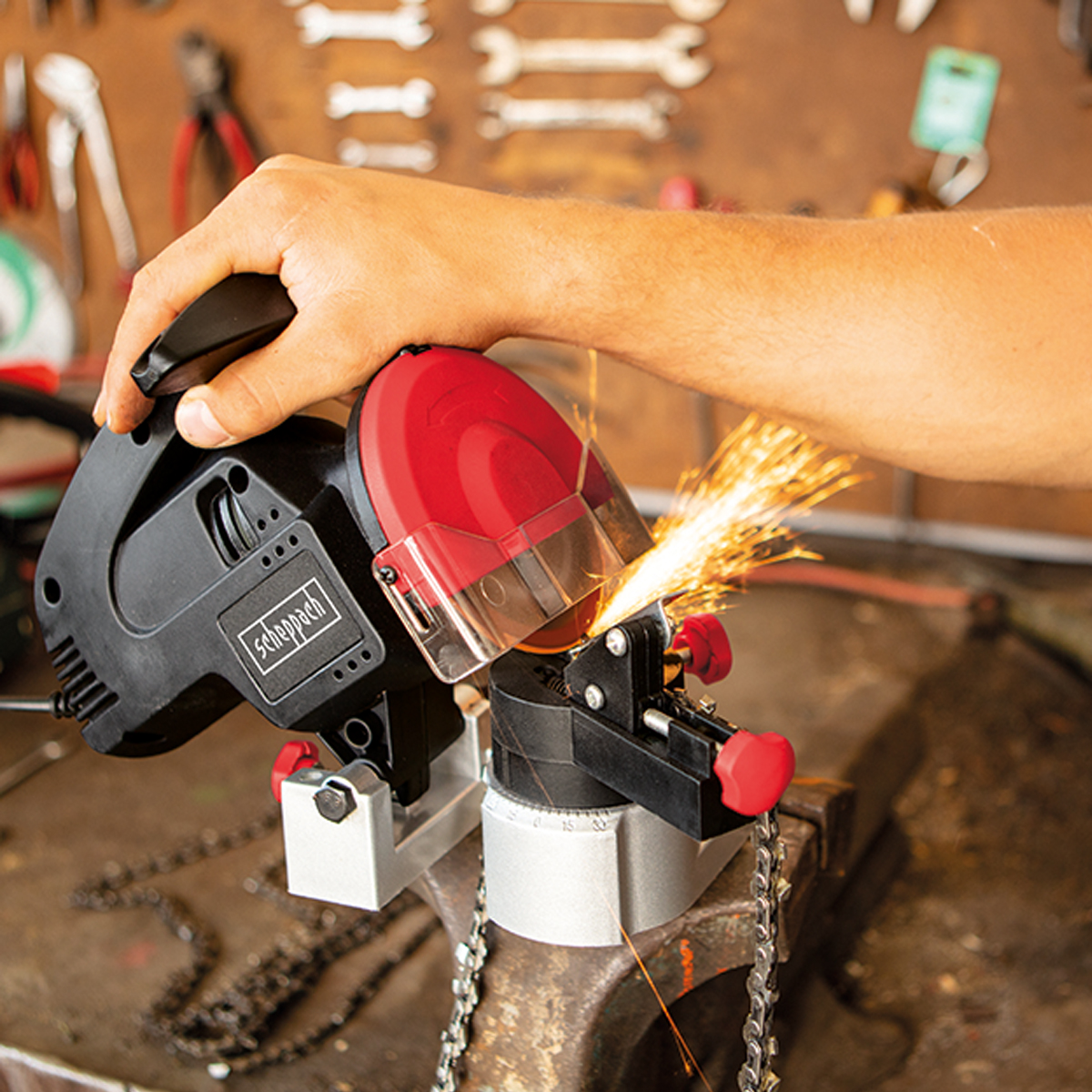 Scheppach KS1200, testere zincirlerinin kesici dişlerini ve bağlantı derinlik sınırlarını doğru açıyla bilemek amacıyla tasarlanmış elektrikli bir zincir bileme / bileme istasyonudur. Zincir testereler kullanıcılarının zincir bakımı yapabilmesi için kompakt ve kontrollü bir çözüm sunar.