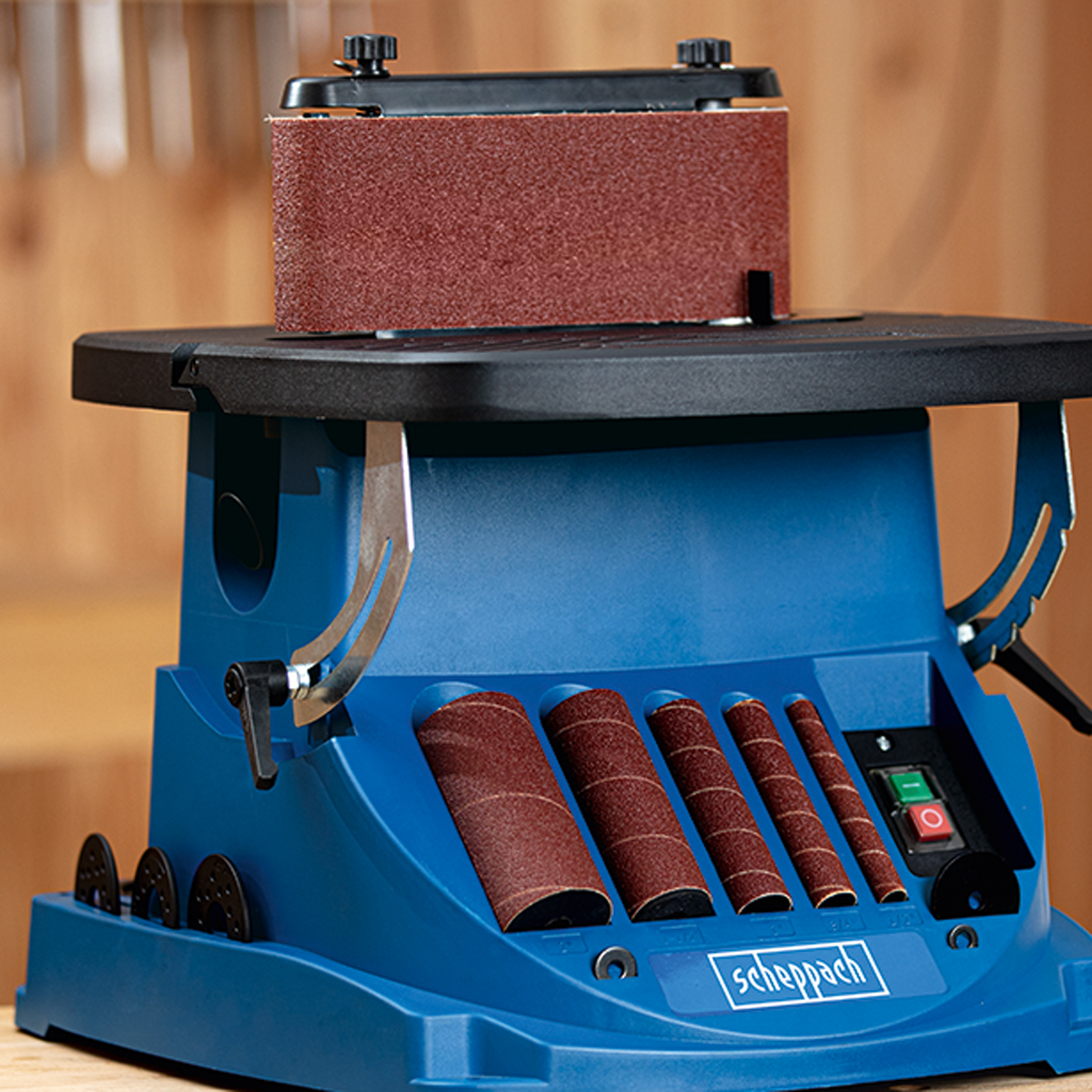 Şerit bant ünitesi ve silindir / mil (spindle) üniteleri: hem düz yüzey hem de silindir tipi küçük detay / kavisli yüzey işleri yapılabiliyor. 5 adet farklı çapta silindir zımpara aparatı geliyor (13, 19, 26, 38, 51 mm) ve kauçuk valçalı destekler.
